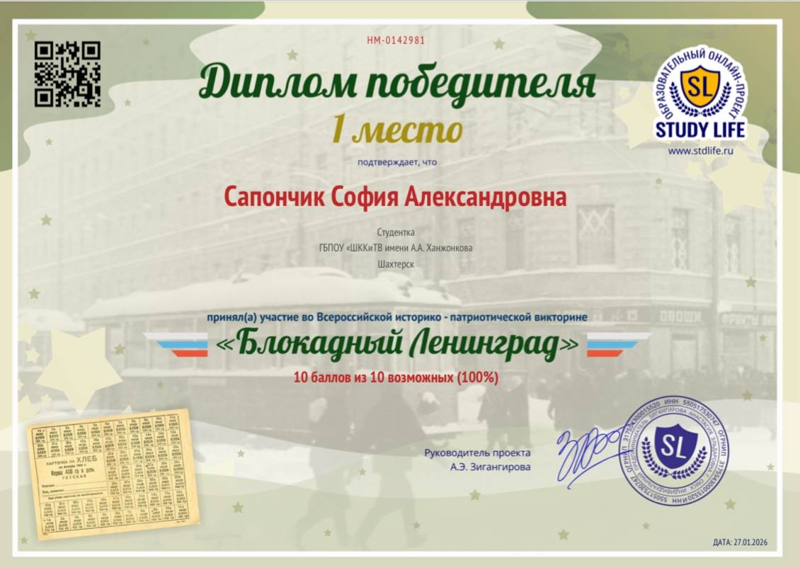 В Шахтерском колледже кино и телевидения имени А.А. Ханжонкова в рамках реализации федерального проекта “Все лучшее детям” национального проекта молодёжь и дети был показан фильм “Брестская Крепость” (2010). С последующим обсуждением фильма и опросом студентов. Мероприятие проведено руководителем клуба КиноМИР-Тамара Ивановна Смирникова.