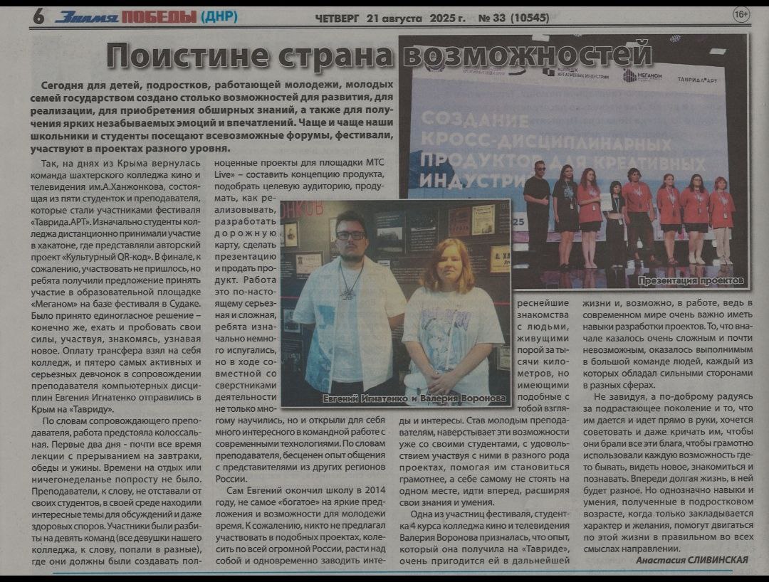 Сегодня для детей, подростков, работающей молодежи, молодых семей государством создано столько возможностей для развития, для реализации, для приобретения обширных знаний, а также для получения ярких незабываемых эмоций и впечатлений. Чаще и чаще наши школьники и студенты посещают всевозможные форумы, фестивали, участвуют в проектах разного уровня. Так на днях из Крыма вернулась команда шахтерского колледжа кино и телевидения им А.А.Ханжонкова, состоящая из пяти студенток и преподавателя, которые стали участниками фестиваля “Таврида.АРТ”.Изначально студенты колледжа дистанционно принимали участие в Хакатоне, где представляли авторский проект “Культурный QR-код”. А финале к сожалению участвовать не пришлось, но ребята получили предложение принять участие в образовательной площадке “Меганом” на базе фестиваля в Судаке. Было принято единогласное решение – конечно же, ехать и пробовать свои силы, участвуя, знакомясь, узнавая новое. Оплату трансфера взял на себя колледж, и пятеро самых активных и серьезных девчонок в сопровождении преподавателя компьютерных дисциплин Евгения Игнатенко отправились в Крым на “Тавриду”. По словам сопровождающего преподавателя, работа предстояла колоссальная. Первые два дня – почти все время лекции с прерыванием на завтраки, обеды и ужины. Времени на отдых или ничегонеделанье попросту не было. Преподаватели, к слову, не отставали от своих студентов, в своей среде находили интересные темы для обсуждений и даже здоровых споров. Участники были разбиты на девять команд (все девушки нашего колледжа, к слову, попали в разные), где они должны были создавать полноценные проекты для площади MTC Live – составить концепцию продукта, подобрать целевую аудиторию, продумать, как реализовать, разработать дорожную карту, сделать презентацию и продать продукт. Работа это по настоящему серьезная и сложная, ребята изначально немного испугались, но в ходе совместной со сверстниками деятельности не только многому научились, но и открыли для себя много интересного в командной работе с современными технологиями. По словам преподавателя, бесценен опыт общения с преподавателями из других регионов России. сам Евгений окончил школу в 2014 году, не самое “богатое” на яркие предложения и возможности для молодежи время. К сожалению, никто не предлагал участвовать в подобных проектах, колесить по всей огромной России, расти над собой одновременно заводить интереснейшие знакомства с людьми, живущими порой за тысячи километров, но имеющими подобные с тобой взгляды и интересы. Став молодым преподавателям, наверстывает эти возможности уже со своими студентами, с удовольствием участвуя с ними в разного рода проектах, помогая им становиться грамотнее, а себе самому не стоять на одном месте, идти вперед, расширяя свои знания и умения. Одна из участниц фестиваля, студентка 4 курса колледжа кино и телевидения Валерия Воронова призналась, что опыт, который она получила на “Тавриде”, очень пригодится ей в дальнейшей жизни и, возможно, в работе, ведь в современном мире очень важно иметь навыки разработки проектов. То, что вначале казалось очень сложным и почти невозможным, оказалось выполнимым в большой команде людей, каждый из которых обладал сильными сторонами в разных сферах. Не завидуя, а по-доброму радуясь за подрастающ