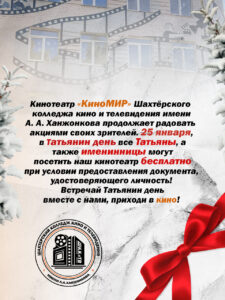 В кинотеатре “КиноМИР” Шахтерского колледжа кино и телевидения имени А.А. Ханжонкова прошла акция к Татьяниному дню – Дню российского студенчества. Наши зрительницы – Татьяны смогли посмотреть новинки отечественного кино “Простоквашино”, “Чебурашка 2”, “Левша”.Для них это был особый сеанс, а мы подарили в этот день особое впечатление от праздника. #КинотеатрКиноМИР#ШахтерскийколледжкиноителевиденияимениААХанжонкова#МинистерствоКультурыДНР Подписывайтесь на наш канал в мессенджере …
