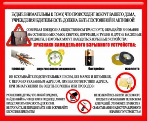 Важно помнить, что начинёнными взрывчаткой могут оказаться не только оставленные подозрительные пакеты, сумки и рюкзаки, но и мелкие вещи: зажигалки, брелоки, кошельки, портмоне и даже отдельные денежные купюры. Особую бдительность следует проявить к оставленным на детских площадках игрушкам, так как они могут использоваться как каркас для взрывного устройства, а их яркий цвет быстро привлекает внимание …