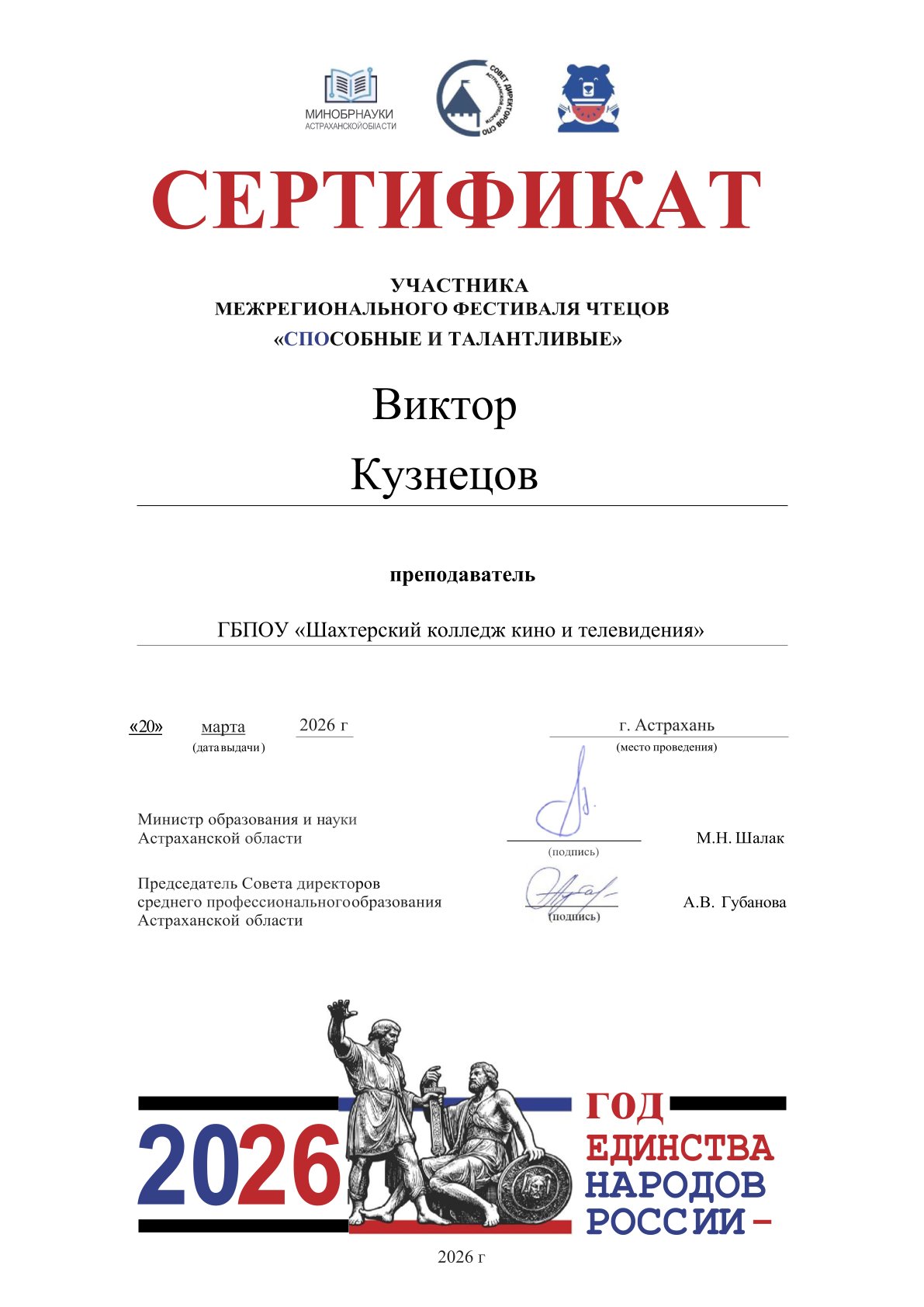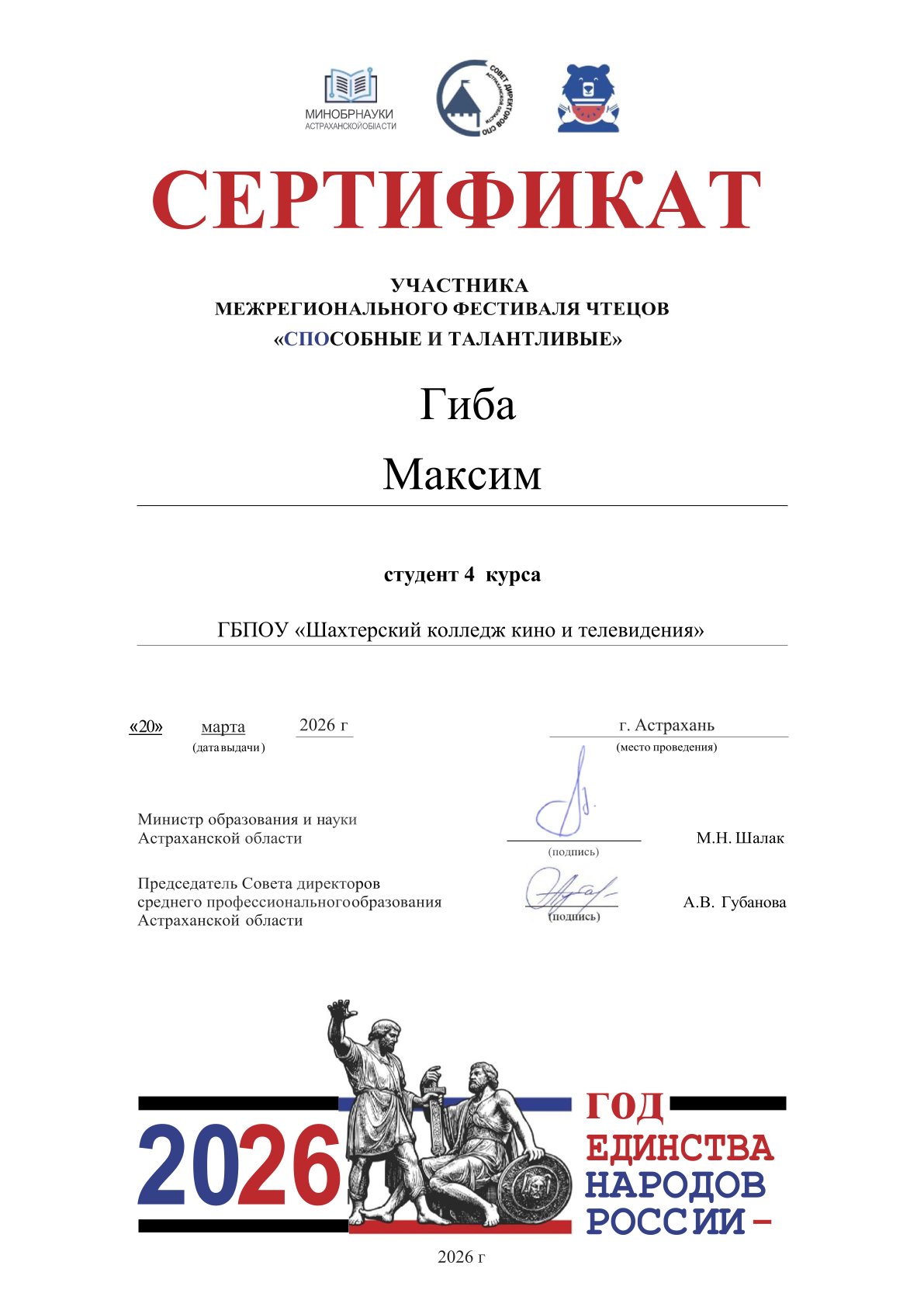 Студенты Шахтерского колледжа кино и телевидения имени А.А. Ханжонкова стали участниками Первого межрегионального фестиваля чтецов “СПОсобные и талантливые”, посвящённого Году единства народов России. Фестиваль чтецов, организованный Советом директоров СПО Астраханской области для СПО ДНР, ЛНР, Республики Крым стал ещё одним ярким примером народного единства. Благодаря поддержке Министерства культуры ДНР Шахтёрский киноколледж имеет возможность раскрывать таланты молодежи, его творческий потенциал.