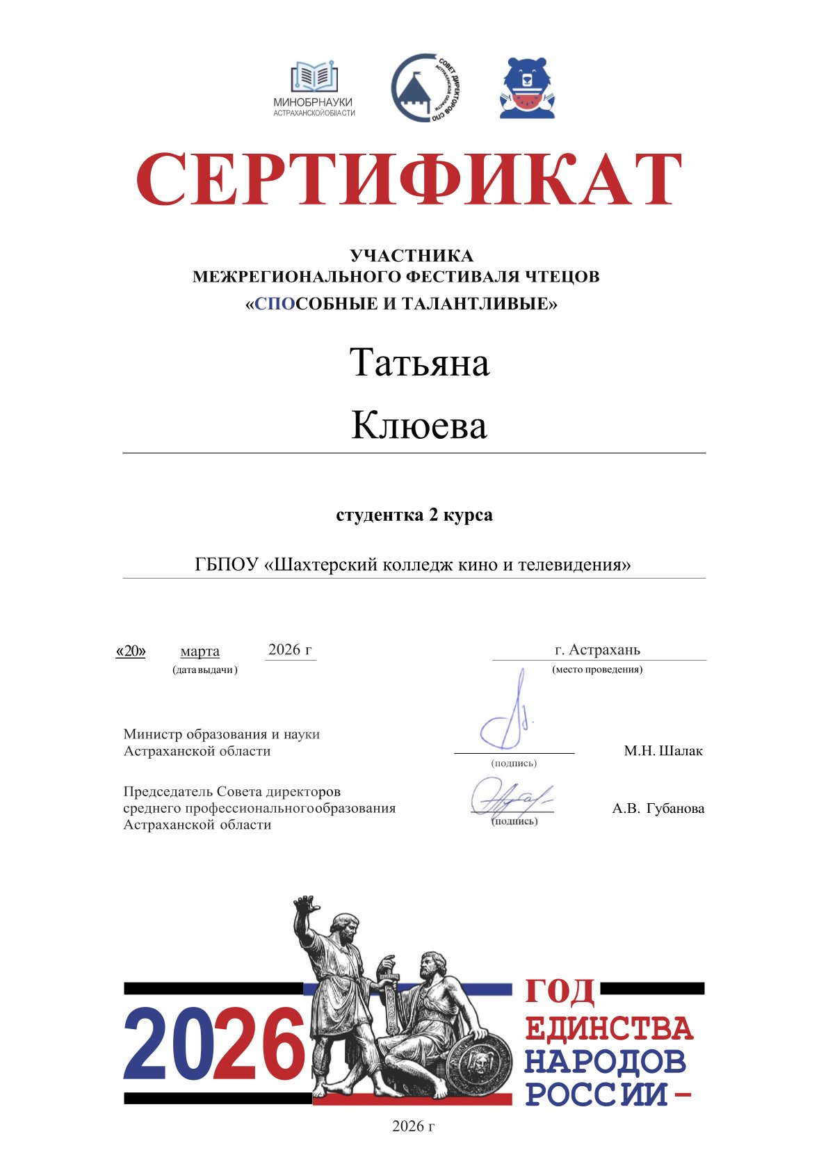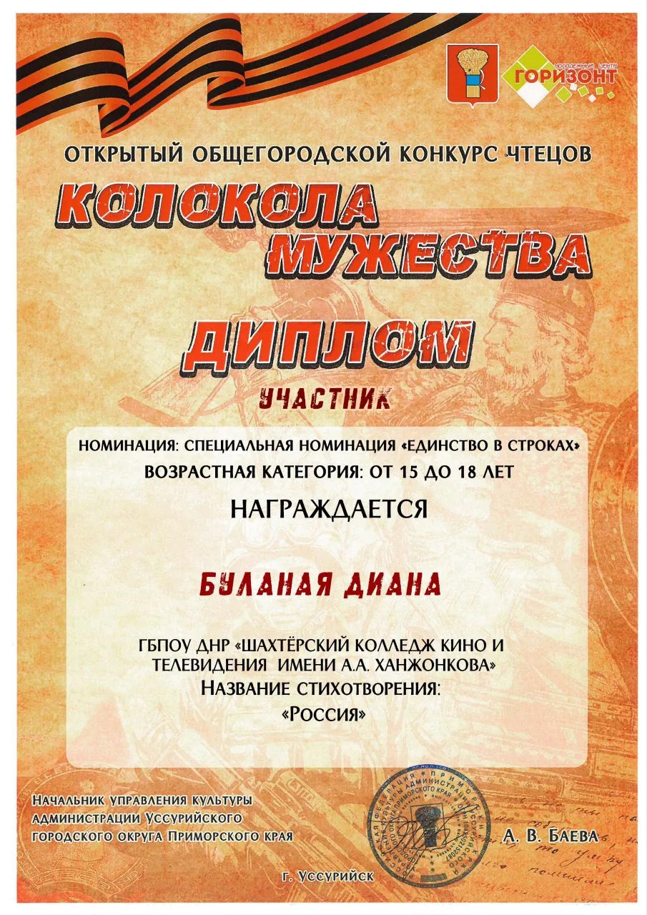 “Единство в строках” – специальная номинация (исполнение произведений, подчеркивающих многонациональное единство народов России, их общую историю и вклад в защиту Отечества, в рамках Года единства народов России) стала ключевой в конкурсе чтецов “Колокола мужества – 2026”. В этой номинации приняла участие Диана Буланая – студентка первого курса Шахтерского колледжа кино и телевидения имени А.А. Ханжонкова. Участие в конкурсе стало возможно благодаря поддержке Министерства культуры ДНР.