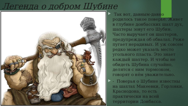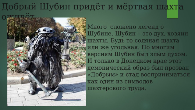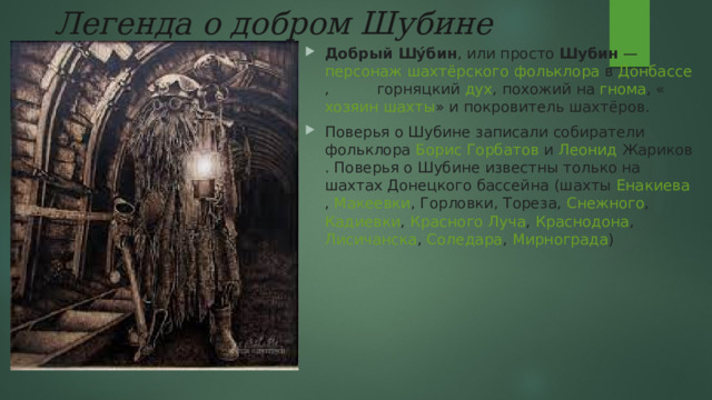 Сегодня предлагаем Вам вспомнить легенду о Добром Шубине- этот персонаж известен в нашем регионе с начала активного развития угольной промышленности в Донбассе. Истории о Шубине широко распространены по всему Донбассу, особенно в таких шахтёрских городах, как Енакиево, Макеевка, Горловка, Шахтерск, Торез, Снежное, Красный Луч, Соледар и других. Каждая шахта имеет свои уникальные легенды о встречах с этим духом.