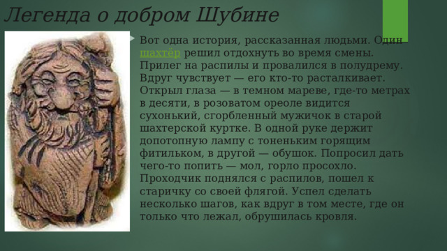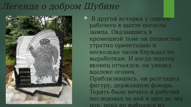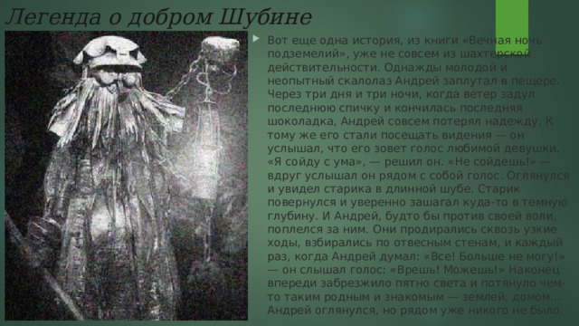 Легенда о Шубине —не просто сказка, а живая традиция, в которой сплелись память о погибших, профессиональный опыт и этика шахтёрского сообщества.